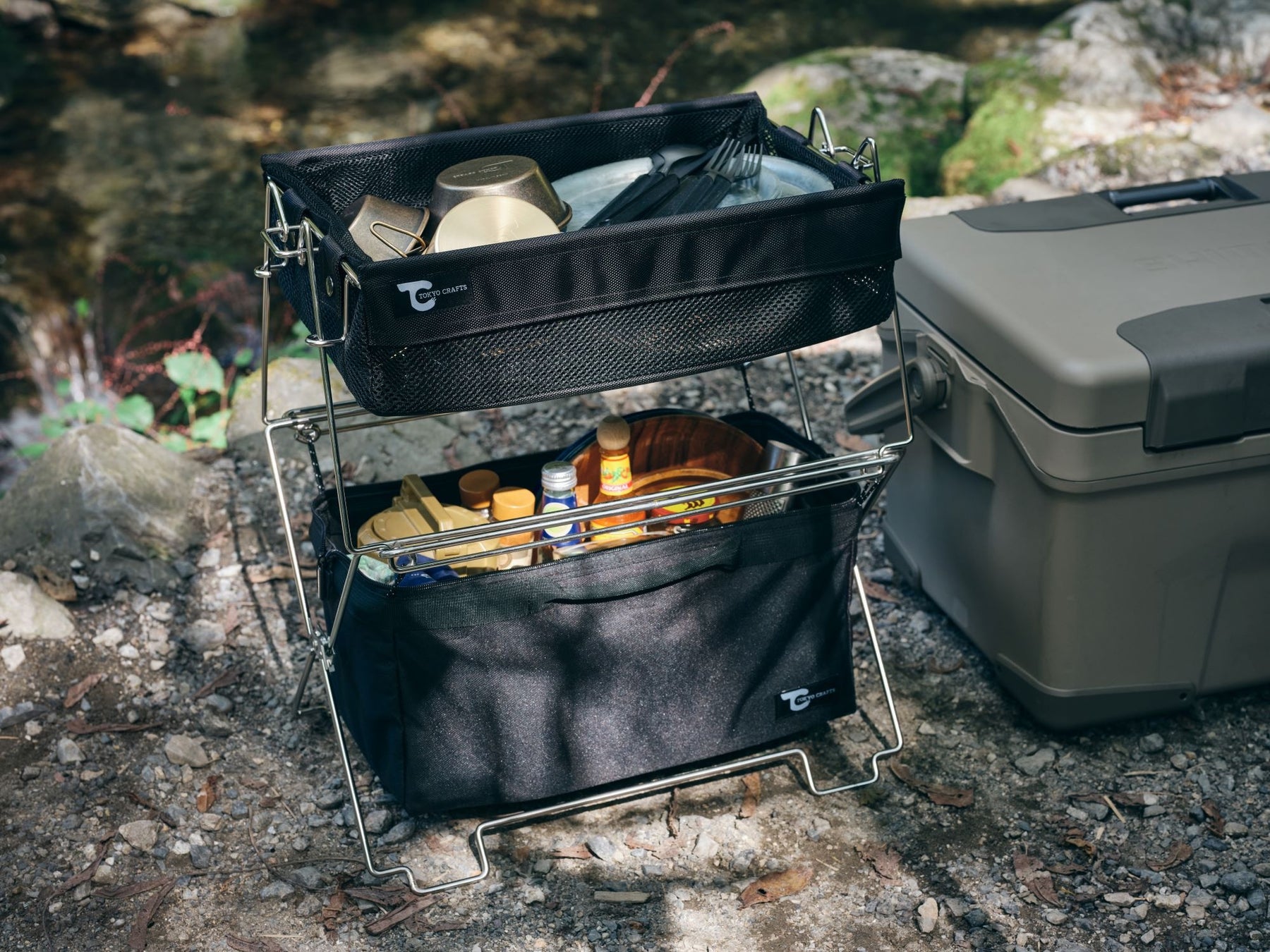 トップボードとマルチスタンドがセットになった「コードユニット」は、ものをかけたり乗せたりするスタンドや、製品同士を上に積み上げたり、横に繋いだり、自在な配置が可能です。地面に置きたくない、ソフトクーラーやソフトコンテナなど、荷物置き場として使えます。ワンアクションで素早く設置でき、折りたたんでフラットになるため片付けや移動時も楽。また、既存商品のバケットシェルフメッシュ(※)にも重ねることもでき、マルチな使い方ができます。スタンド設置時の耐荷重は15kgとなっています。