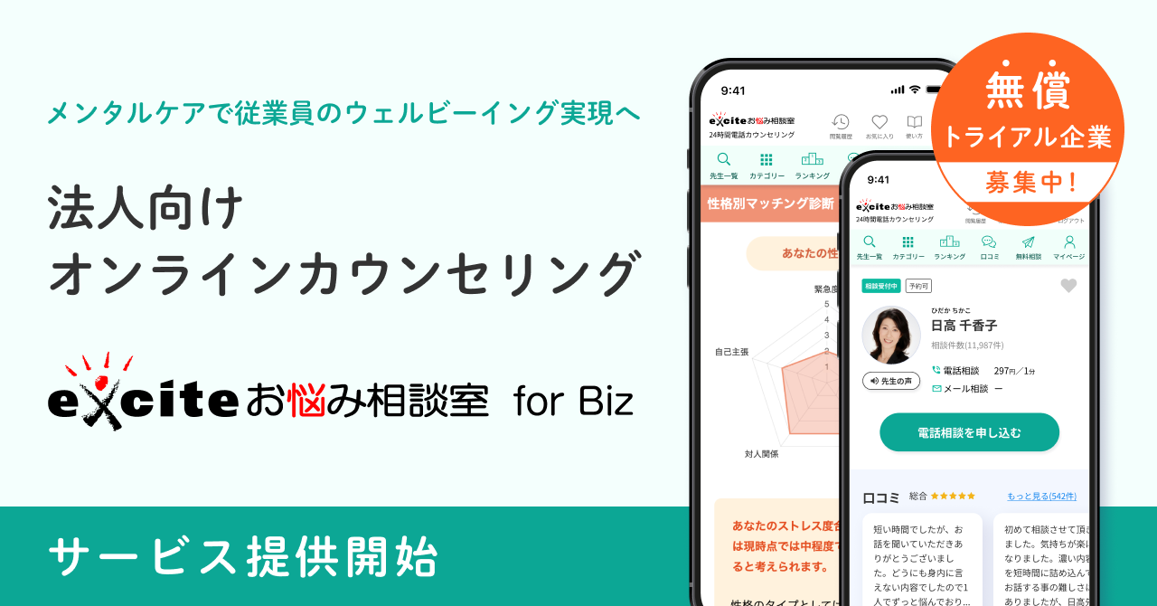 「エキサイトお悩み相談室」は2006年のサービス開始以来、メンタルヘルス・恋愛・人間関係・仕事・家庭問題など、様々なお悩みを抱える個人のお客様に向け、オンラインでのカウンセリングを提供してまいりました。日本最大級(※2)のオンラインカウンセリングサービスとして、相談満足度95%以上、累計30万件以上相談実績を誇る「エキサイトお悩み相談室」だからこそ、従業員の方の幅広いお悩みに対応でき、ご活用いただけるカウンセリングサービスを提供できるのではないかという思いから、本サービス開始に至りました。