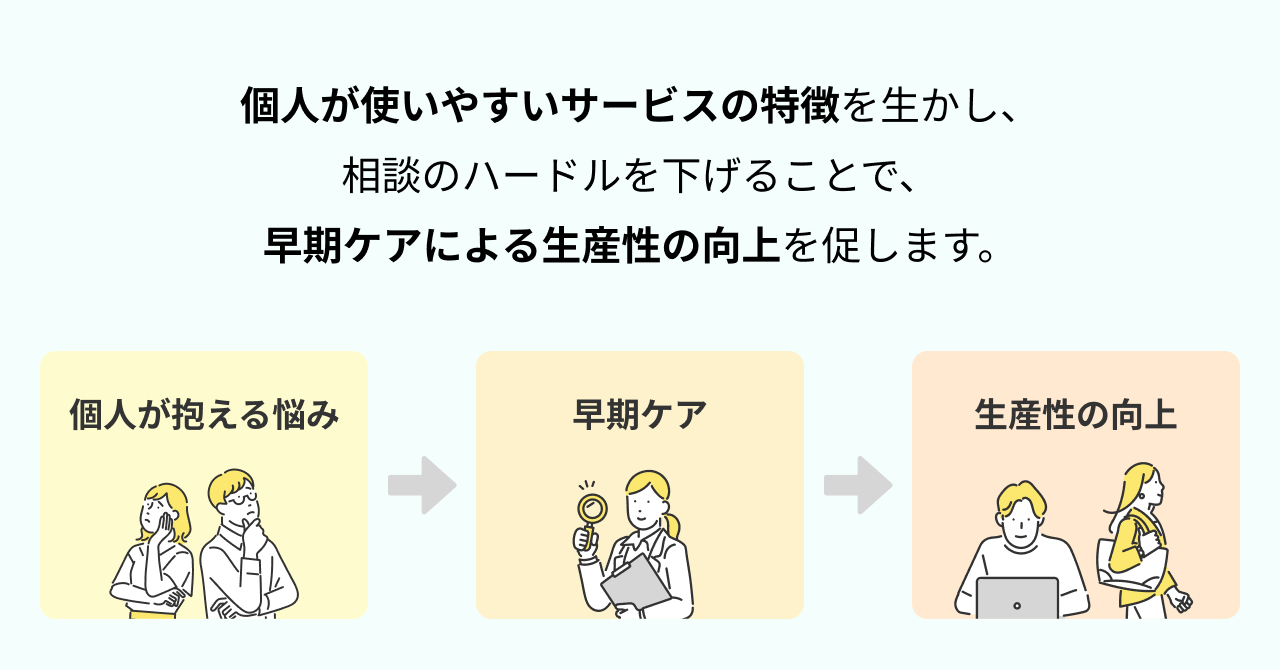 本サービスは、個人が使いやすいサービスの特徴を生かし、相談のハードルを下げることで、早期ケアによる生産性の向上を促します。