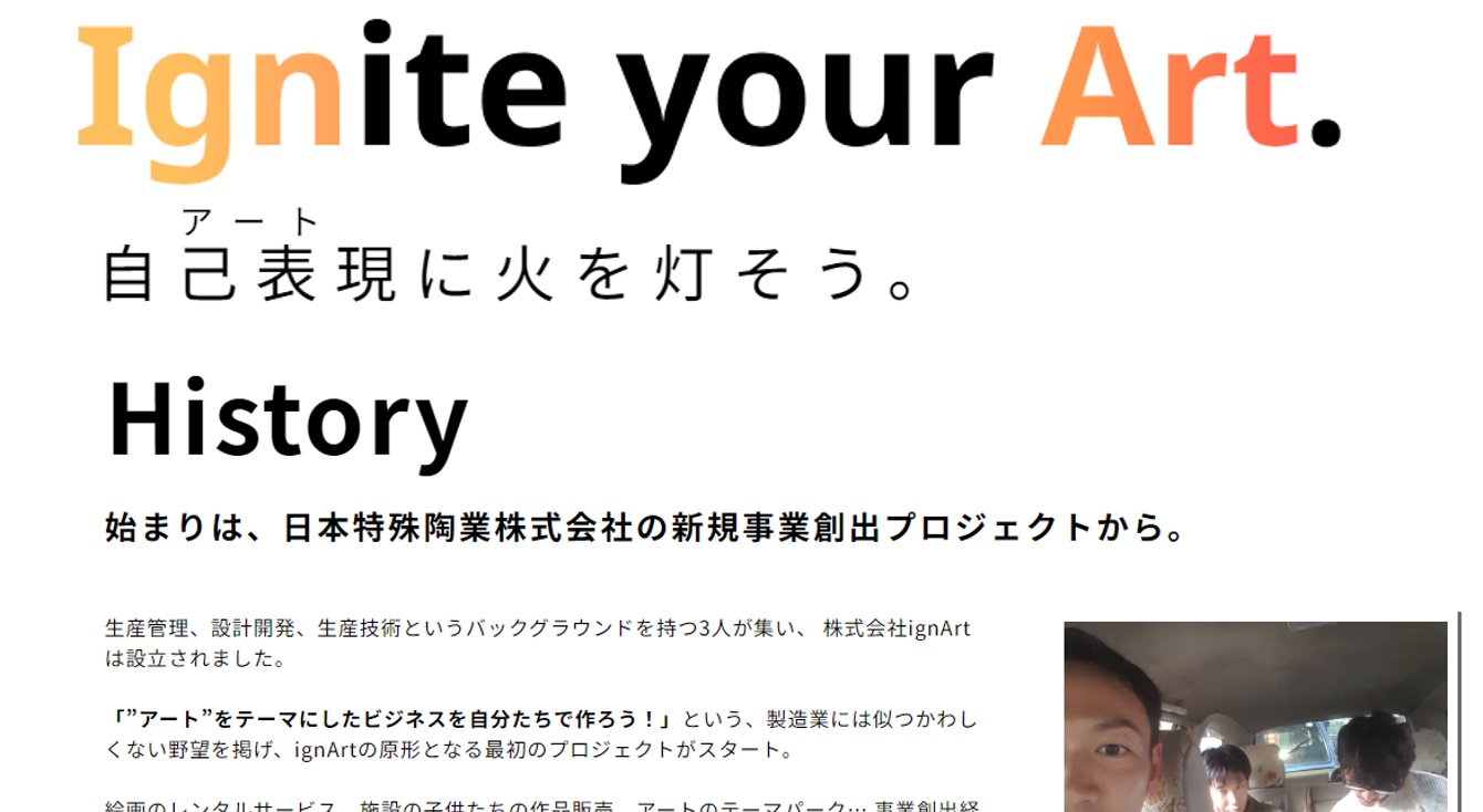 株式会社ignArtは9月25日に自社ホームページを一新し、日本特殊陶業株式会社の新規事業創出プロジェクトから子会社化に至るまでの、創業メンバーの思い、試行錯誤の経緯などのストーリーを公開しました。