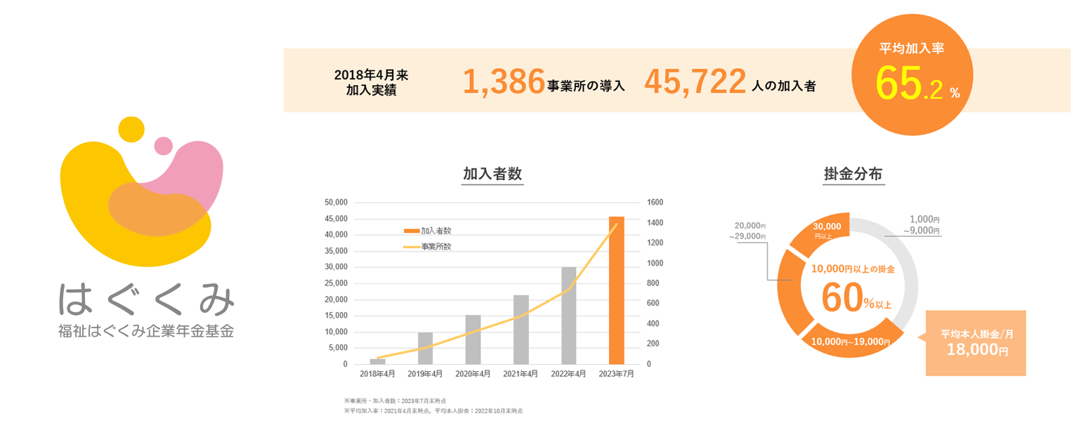 「はぐくみ基金」は経営者や役員も加入可能な企業年金基金で、事業主側は元手なし*³で企業年金・退職金制度を構築できます。企業年金・退職金制度充実が従業員満足度向上・離職率低下につながることから、特に人手不足が深刻化している福祉業界において、人材定着をはかるための福利厚生の1つとしてご好評いただいています。