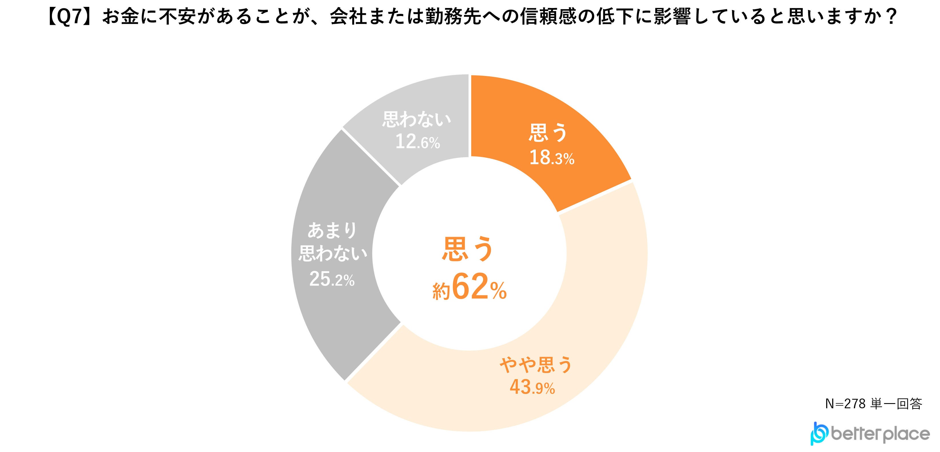 「思う」、「やや思う」と答えた人が62.2%という結果となり、お金の不安が勤務先に対する信頼感の低下につながると多くの人が感じていることが分かりました。