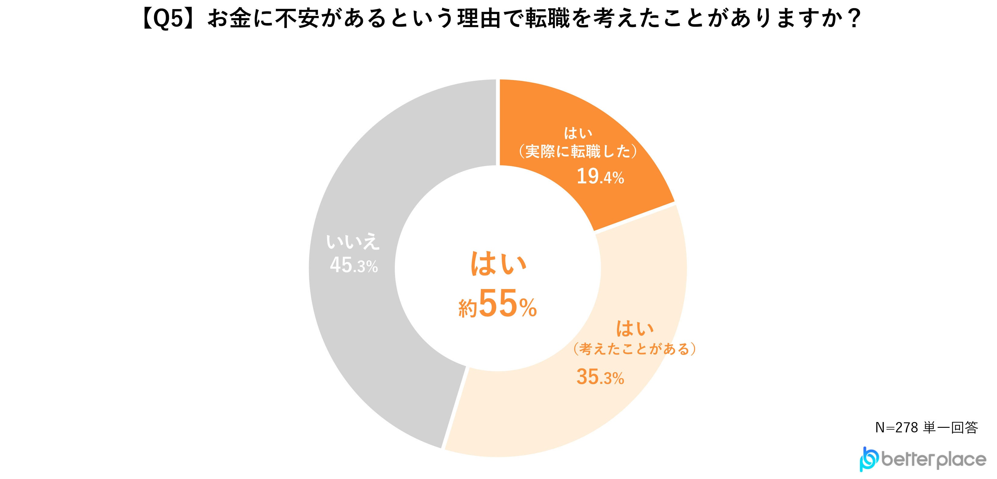 「はい(実際に転職した)」、「はい(転職はしていないが考えたことがある)」と答えた人が54.7%という結果となり、過半数以上の人がお金の不安を理由に転職を考えたことがあることが分かりました。