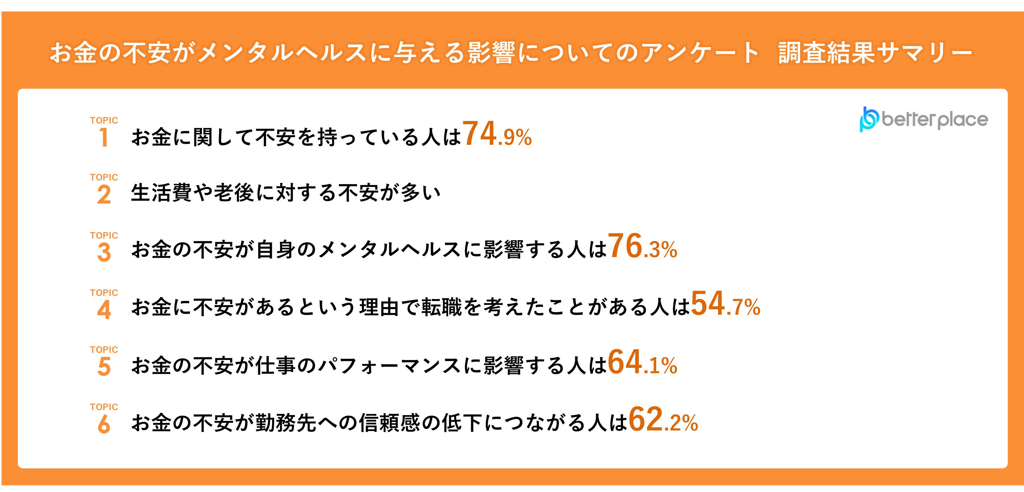 今回の調査は、企業経営者や人事部門の方が最も大切にしたい従業員のメンタルヘルスについて、お金の不安と関連性があるのか、また、それが仕事のパフォーマンス低下に影響しているのか等を調査いたしました。