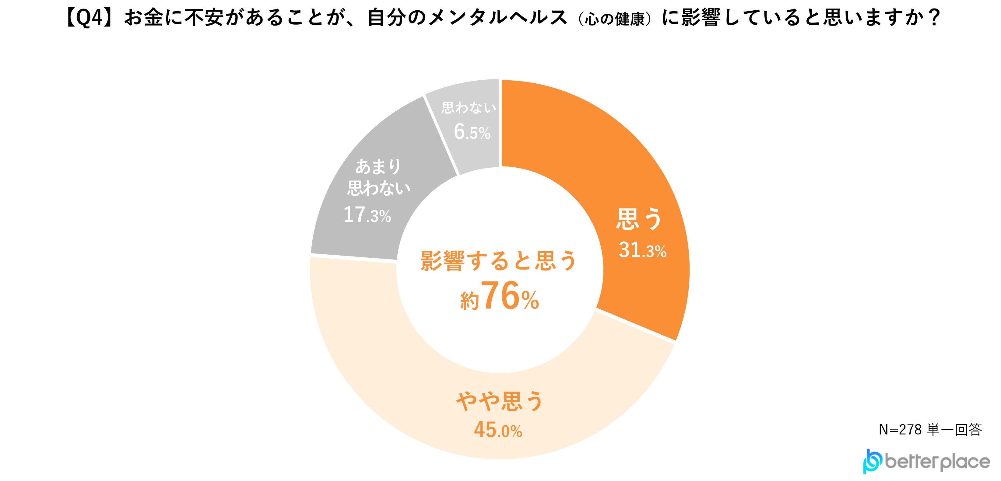 「思う」、「やや思う」と答えた人が76.3%という結果となり、お金の不安が自身のメンタルヘルスに影響していると多くの人が感じていることが分かりました。