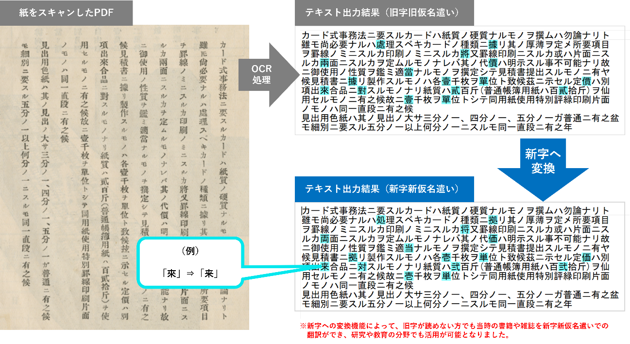 例えば、透明テキスト付PDFで新字新仮名文字を重ね合わせることで、過去の歴史的資料の検索性が圧倒的に高まると考えております。