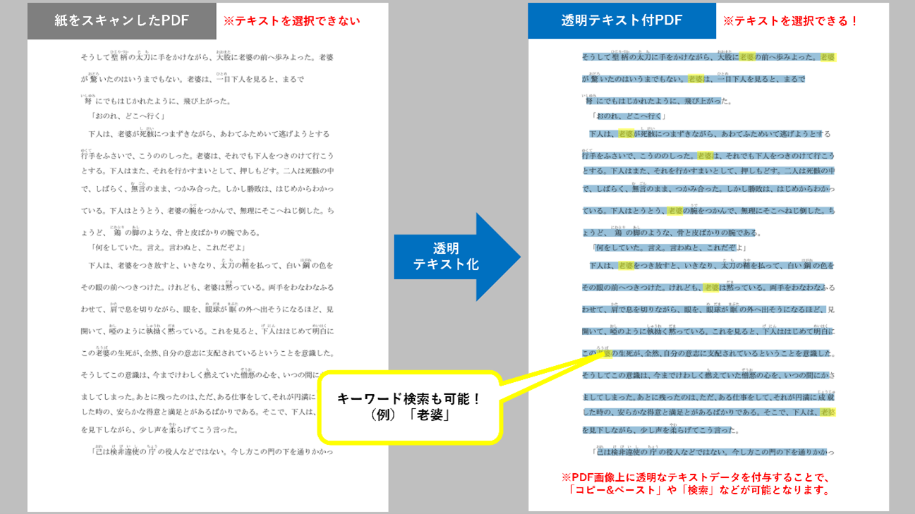 テキストファイルでの出力に加え、透明テキスト付PDFでの出力も可能です。こちらにより、出力したPDF内でテキスト検索などを行うことが可能です。