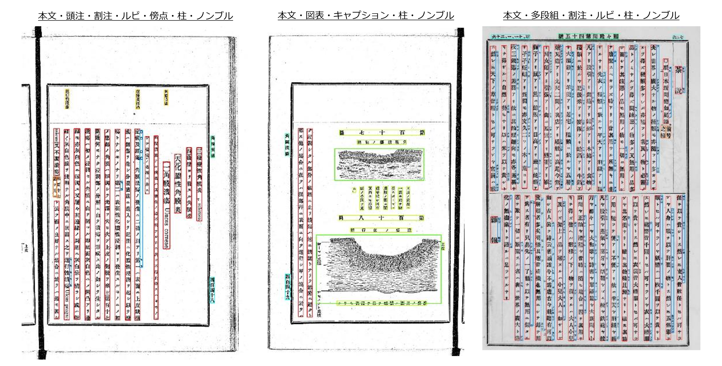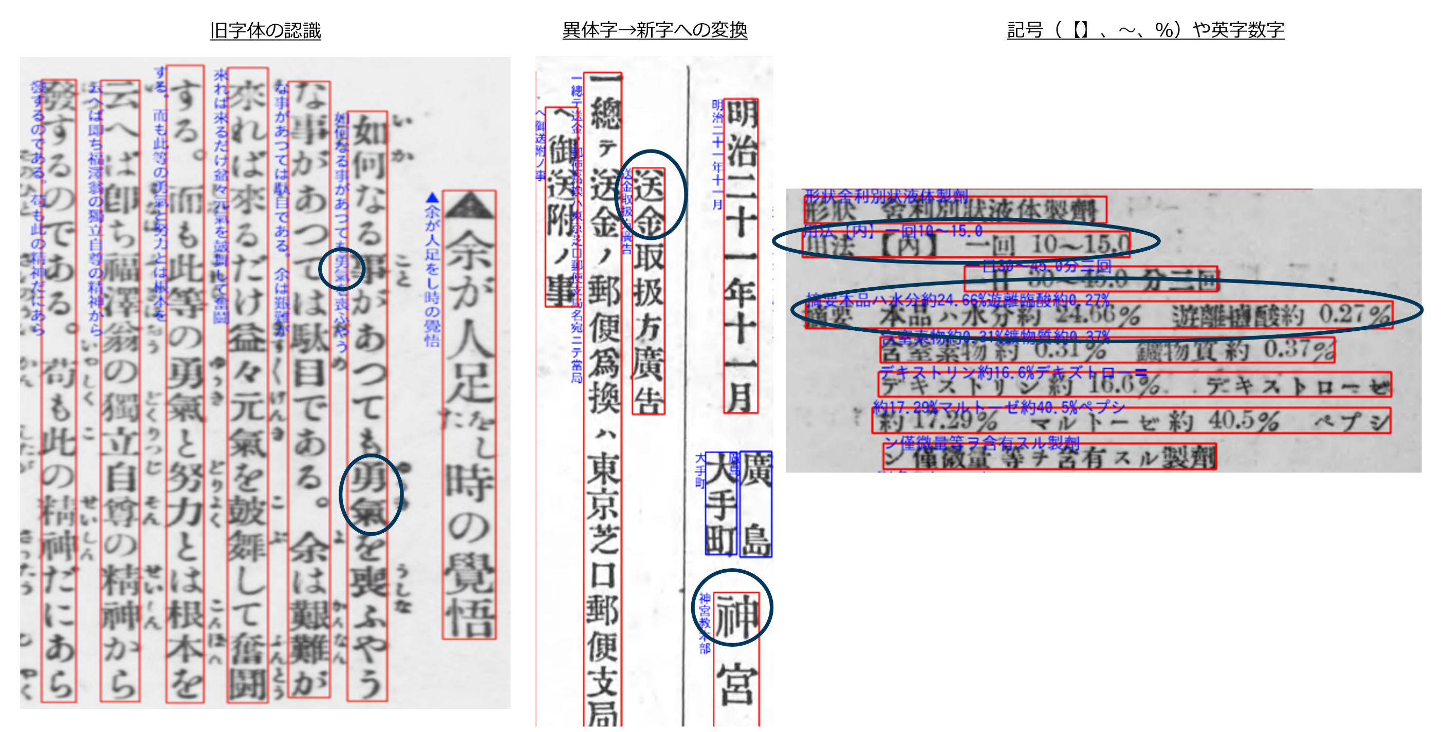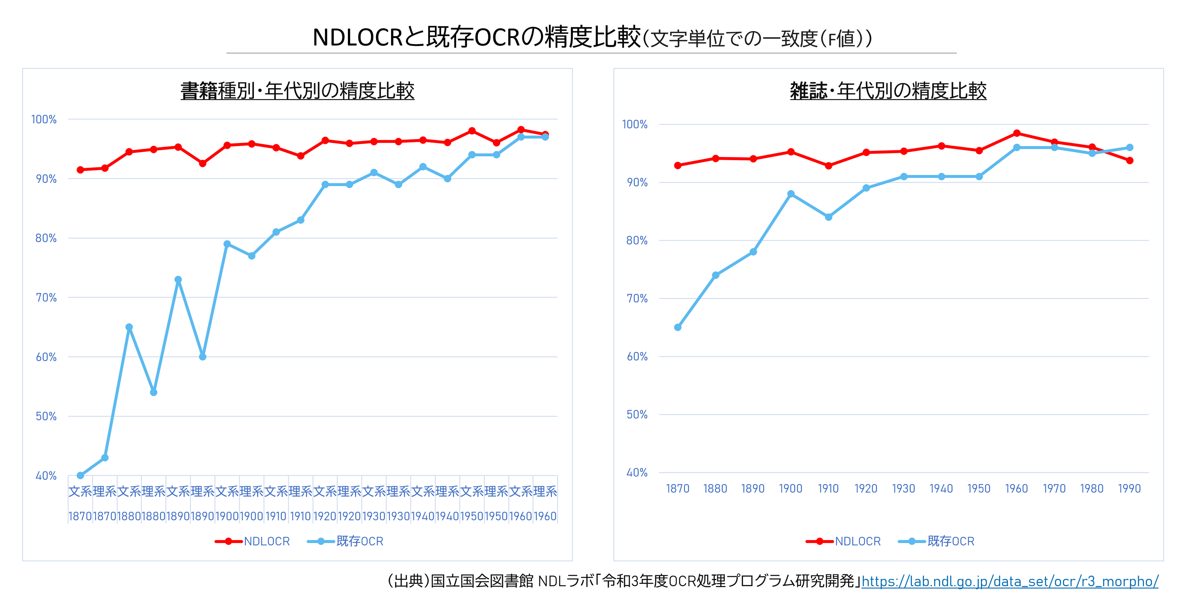 1860年代以降の書籍・雑誌において市販OCRより高い90%以上の精度で判定可能となりました。(注5)特に明治期~昭和初期の近代書籍・雑誌においては、市販OCRより約2倍(約40%→90%以上)の読み取り精度となりました。