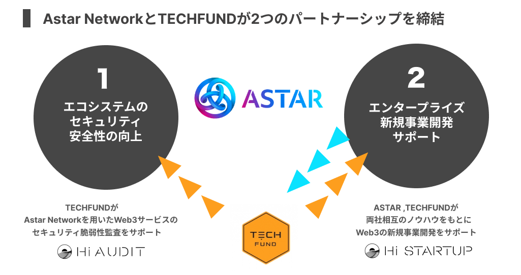 TECHFUNDはAstar Networkと共に、Astar NetworkエコシステムのWeb3プロジェクトのセキュリティ安全性の向上、またAstar Networkを用いたエンタープライズ向けの新規事業開発を両社で相互にサポートしてまいります。