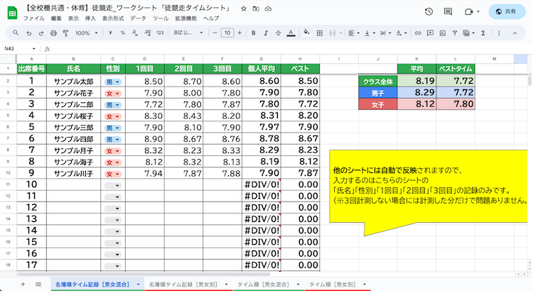 本テンプレートでは、タイムを計測後に数値を入力するだけで、個人平均やベストタイム、さらにクラス平均やタイム順まで自動で作成されます!