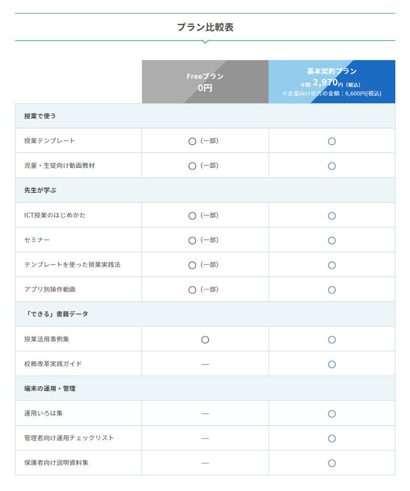 基本契約プランでは、今回ご紹介した体育・保健授業のテンプレートはもちろん、教科書と連動した教材テンプレートや「できるシリーズ」の書籍データ、端末の運用・管理に関する資料など、500以上の豊富なコンテンツをご用意しています。(Freeプラン:約100コンテンツ)