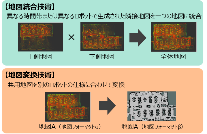本研究では、今後普及が想定されるサービスロボット間で地図を共用するための地図シェアリング技術の確立のため、異なる時間帯または異なるロボットで生成された隣接地図を一つの地図に統合する地図統合技術、および、ロボット仕様に合わせた地図に変換する地図変換技術に関する実証・評価を行います。具体的には、実フィールドトライアルを通じて、本技術において統合・変換された地図を「ロボ★メン」サービスにおいて商用提供されているオフィス清掃ロボットやその他ロボットに配信し、それらロボットが清掃などの業務を完遂できるかなどのフィージビリティ評価に加え、現場スタッフがWEBアプリケーションを用いて地図統合・変換などの操作を問題なく遂行できるかなどのユーザビリティ評価を行います。