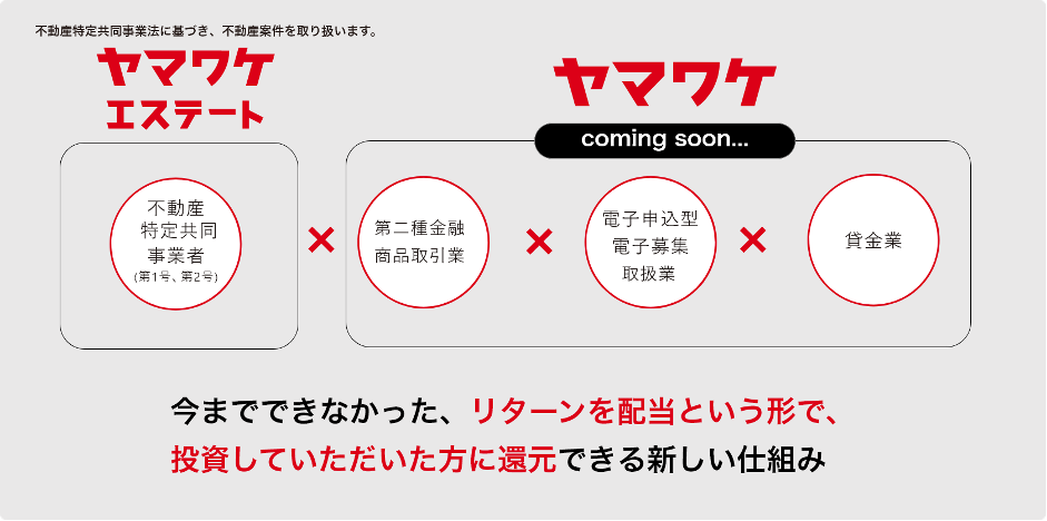 ※WeCapital株式会社が運営する「ヤマワケ」及びヤマワケエステート株式会社が運営する「ヤマワケエステート」が取り扱う商品は、元本が保証されているものではなく、投資対象となる匿名組合財産の価値の低下等により、お客様が出資した元本の損失が生じる可能性があります。各商品に係る手数料並びにリスク等の内容や性質は投資対象の商品毎に異なりますので、投資の判断はご自身で行うようお願いいたします。