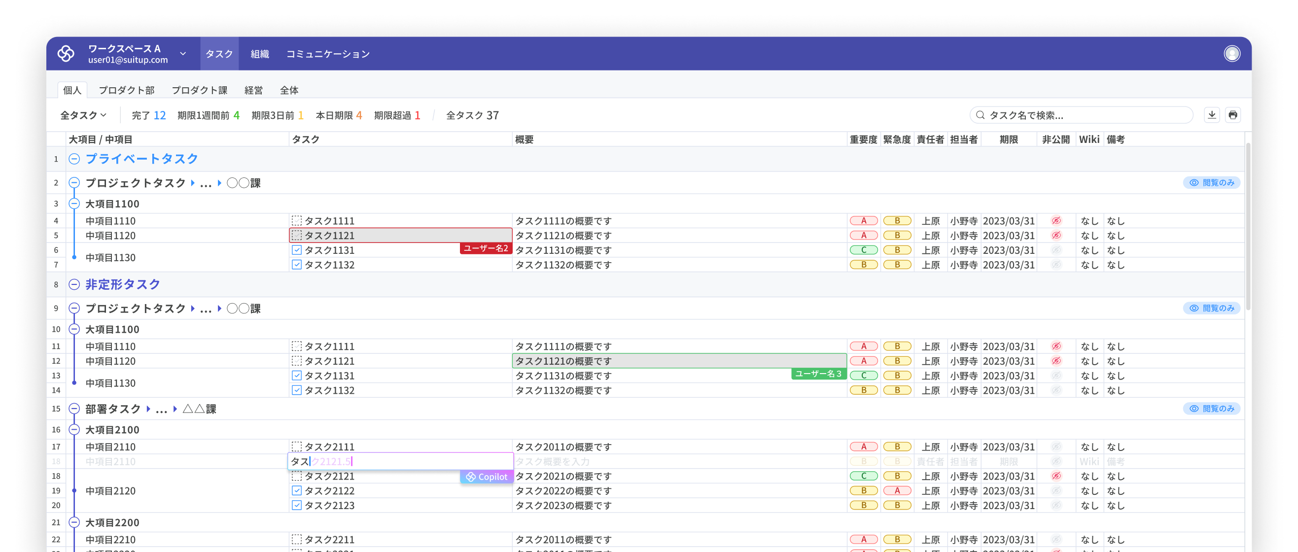 会社組織に属するそれぞれの立場でタスクを把握しやすいように、個人、部署、プロジェクトや全社などの単位での定型タスク及び非定型タスクの設定機能があります。