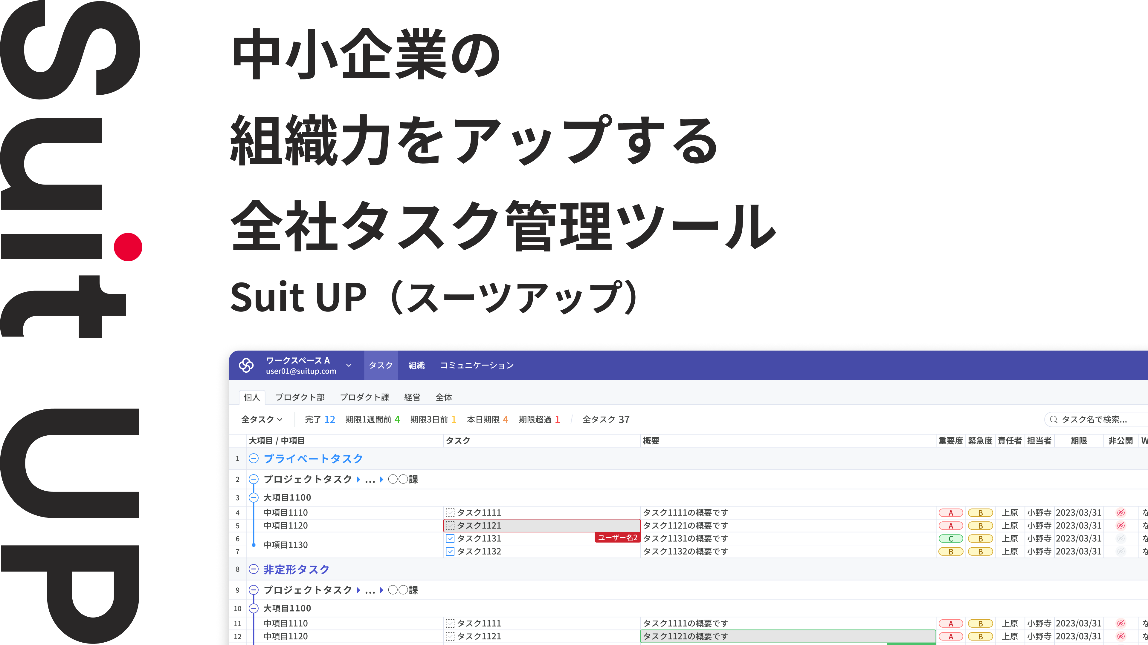 「Suit UP」は、中小企業等の組織力をアップする全社タスク管理ツールで、経営者の目線で、組織・タスク・コミュニケーションを「再構築」し、中小企業等の利益体質を実現するSaaS(Software as a Service)サービスです。