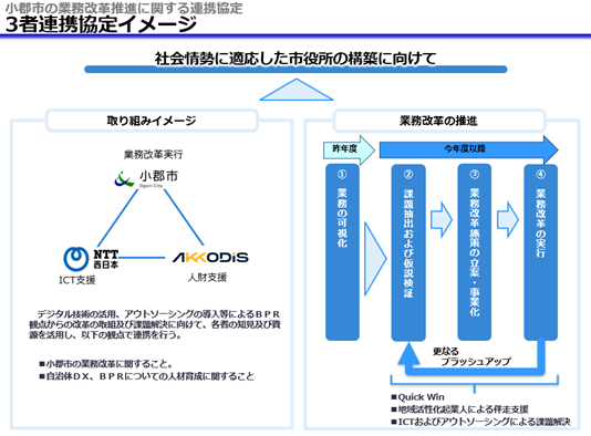 そうした背景のもと、小郡市、NTT西日本、AKKODiSコンサルティングの3者が互いに協力することで、小郡市の業務プロセス最適化に向けた取組を加速化させ、行政サービスの維持、さらには向上の実現をめざすため、連携協定を締結することになりました。