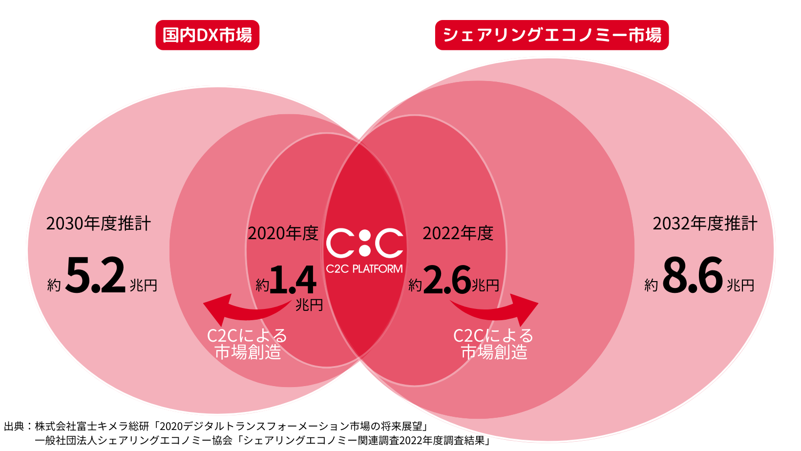 C2C社がアプローチする市場は「日本国内のDX市場」と「シェアリングエコノミー市場」。