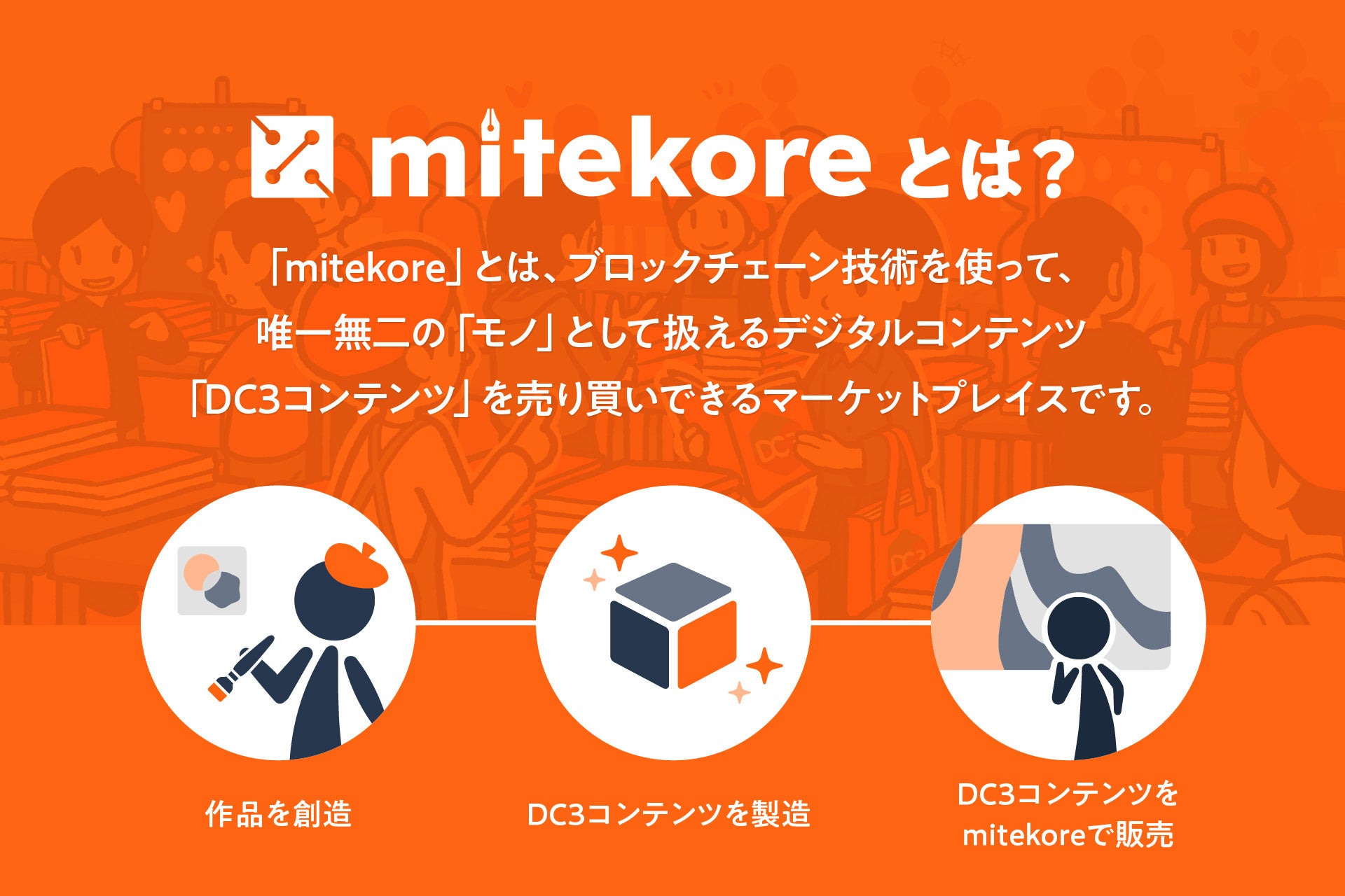 「mitekore」とは、ブロックチェーン技術を活用した「DC3」というデジタルコンテンツがもたらす新しい体験により、即売会や個展と同じ感覚でファンへ作品を販売することができるマーケットプレイスです。