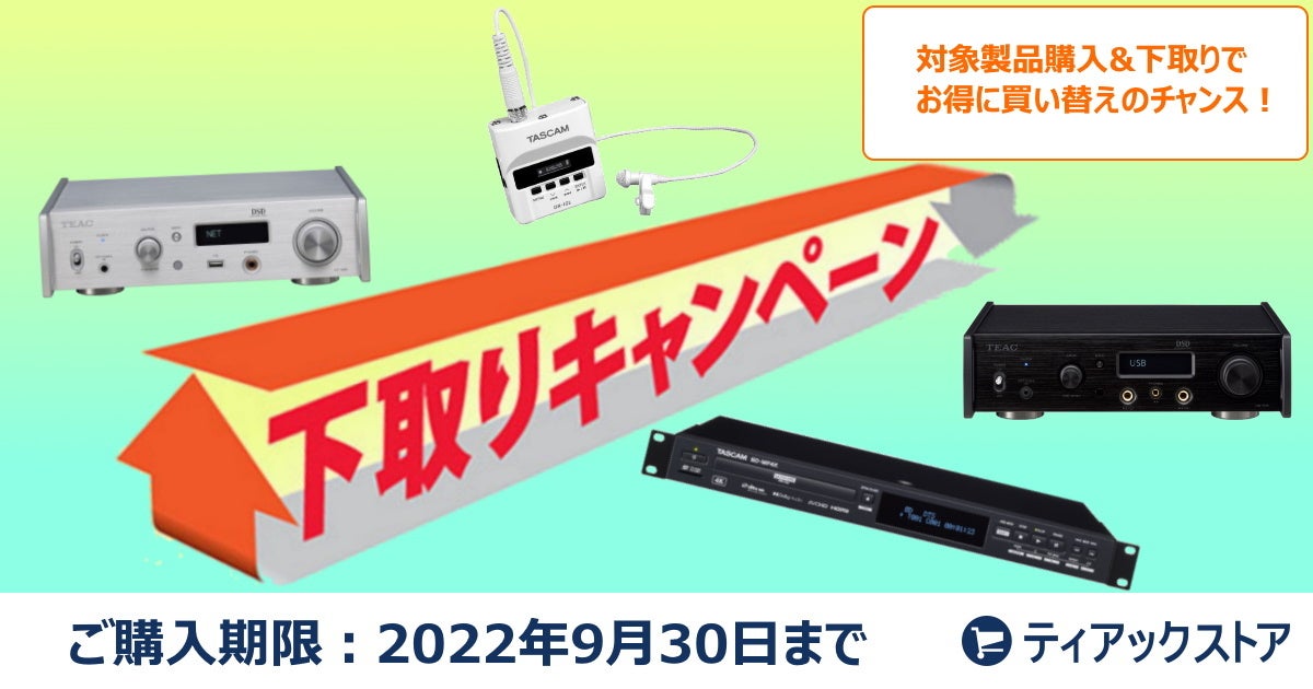 ティアック株式会社公式オンラインストア「ティアックストア 本店」 https://store.teac.co.jp/html/にて、期間中にキャンペーン対象製品をご購入の際、お手持ちの対象下取り品をお送りいただくと、所定の金額で下取りさせていただきます。