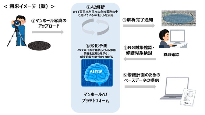 一方、NTT東日本ではインフラ通信事業者として、通信ビル・電柱・とう道・ケーブル等の多くの通信設備を維持・管理しています。その維持・管理業務において、デジタル技術を活用して作業・業務の効率化を図っており、横浜市におけるマンホール点検業務のDX推進に貢献できると考え、「YOKOHAMA Hack!」に応募し、この度、実証実験プログラムを開始するに至りました。