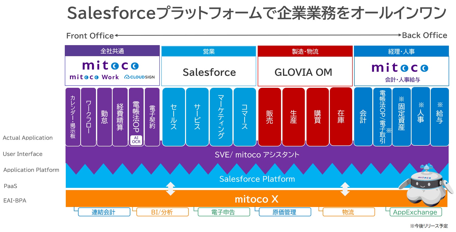 顧客情報管理から、グループウェアや財務会計、人事給与、販売購買管理などのバックオフィス業務を統合しSalesforceのプラットフォーム上で管理する考え方を総称して「mitocoERP」と表現しています。