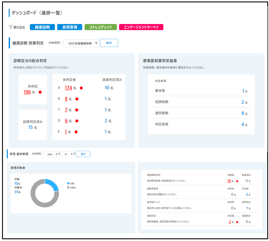 健康診断の受診促進、健診後の就業判定、ストレスチェックの事後措置、長時間労働者への面接指導…従業員の健康管理には、法律で定められた対応も多くあり、漏れなく実施することが求められます。健康管理システム『HealthCore』のダッシュボードでは、健診の受診状況も就業判定の進捗も面接指導の対象人数も一目で確認でき、確実に対応できます。