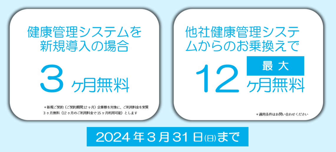 健康管理システム『HealthCore』は、新規導入・他社健康管理システムからお乗換えの企業様を対象に、利用料金が最大12ヶ月無料となる特別プランをご用意します(2024年3月末までにお申込の企業様対象)。詳細はサービスサイトから、もしくは弊社担当までお問い合わせください。