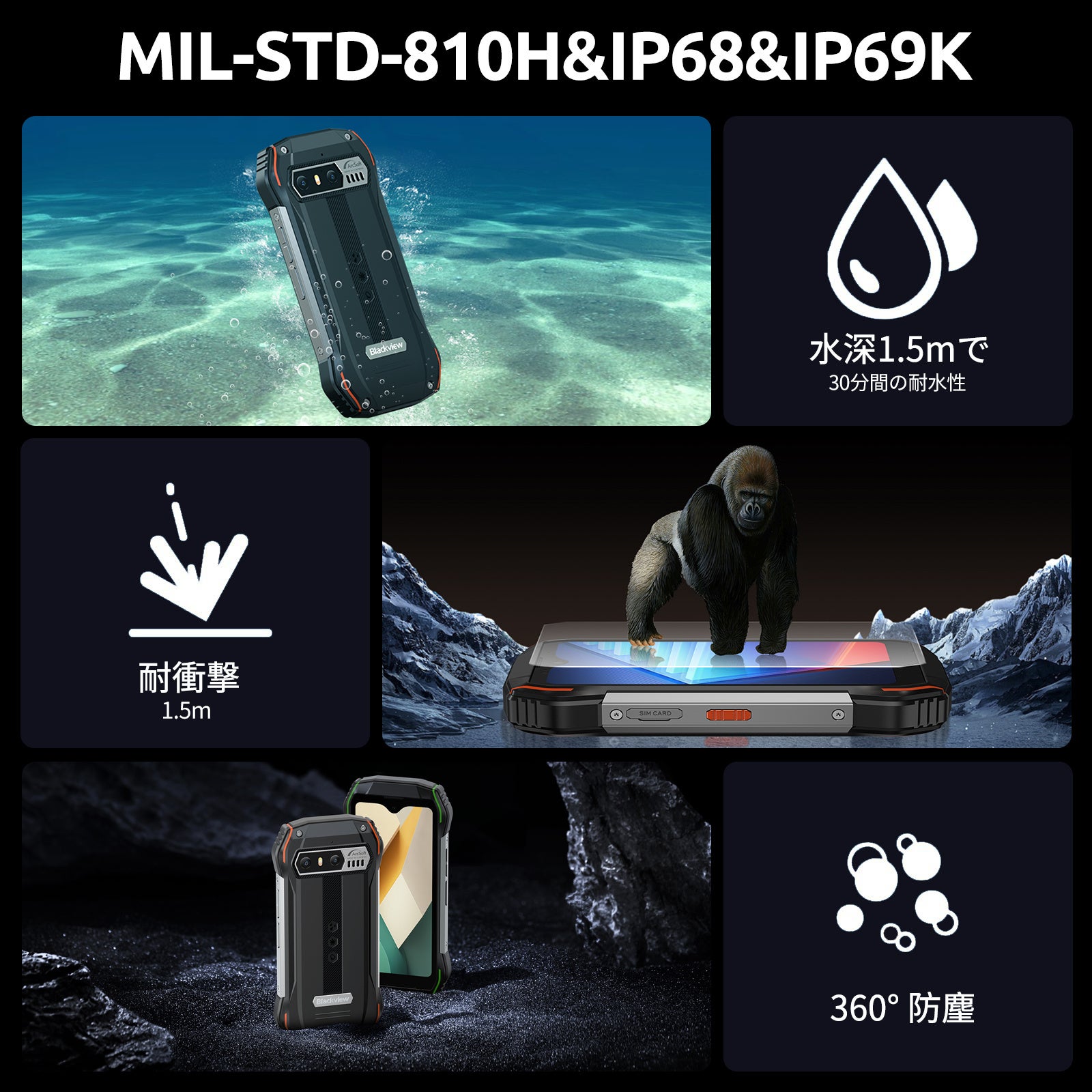 Blackviewが提供するスマートフォンは、耐久性に優れた小型タフネススマホです。最新のMIL-STD-810H規格に基づいて設計されています。この規格により、100%防塵性能、1.5メートルまでの耐落下性、高低温に耐える性能が保証されています。また、30分間の水深1.5メートルまでの完全な防水性能を備えています。これにより、あらゆる状況で優れた耐久性と信頼性を発揮します。 さらに、このスマートフォンの小型サイズは4.3inch、133mm65.25mm18.4mmとコンパクトで、重量はわずか208gです。このコンパクトなデザインは、持ち運びやすさを重視した方に最適です。旅行やアウトドアアクティビティ、日常の忙しい生活にも便利に対応します。この小型三防スマートフォンは、その頼りになる性能と便利な携帯性により、あらゆるシーンで頼りになるパートナーとなることでしょう。