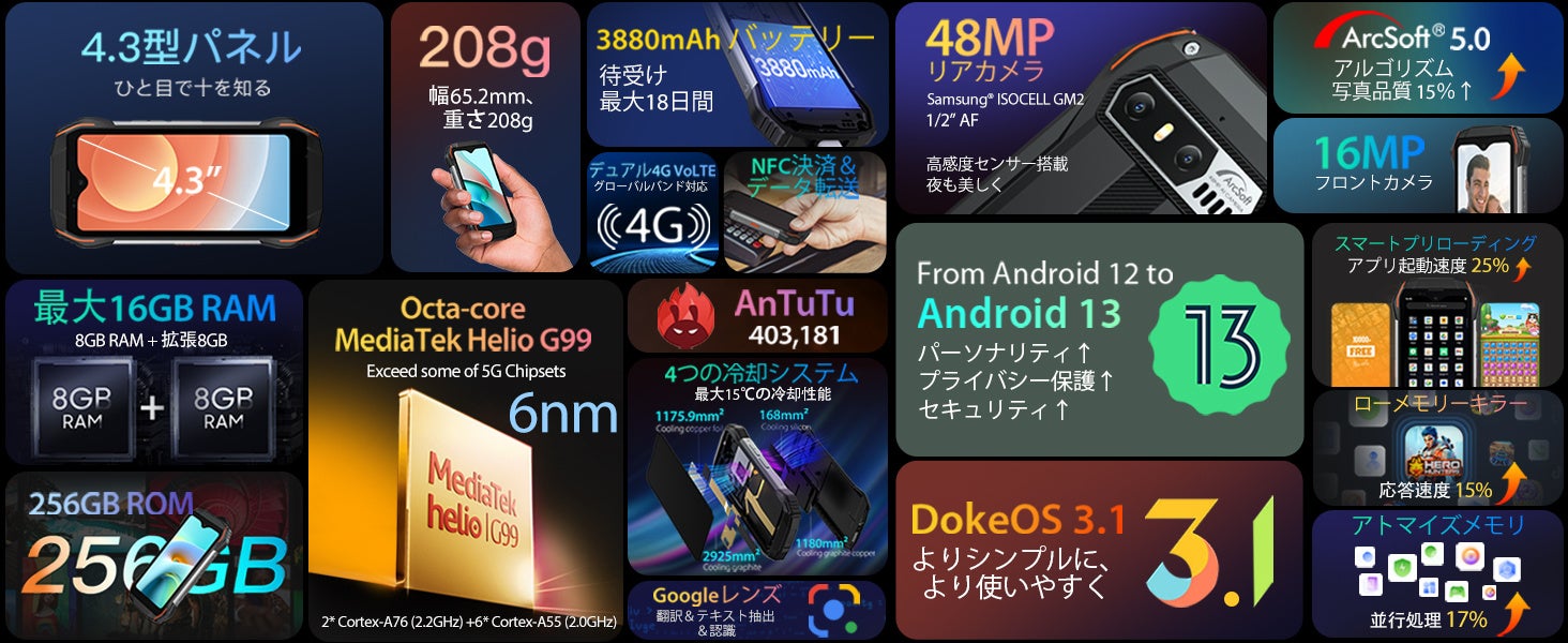 8コアG99 CPU/ Android 13 /4.3インチ QHD/4G LTE/ 16GB(8GB+8GB仮想)RAM+256GB / 48MP+16MP/MIL-STD-810H認証/防水防塵耐衝撃/18W 急速充電/3880mAh