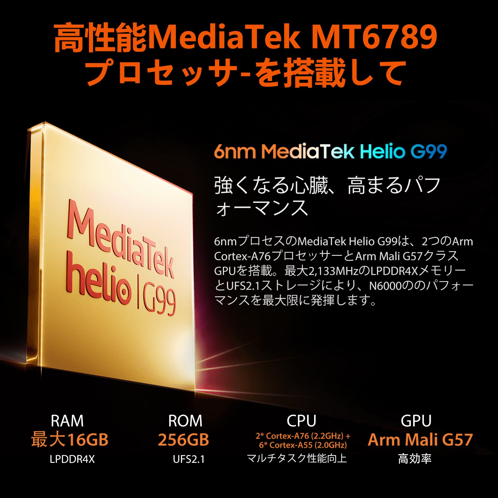 Blackview N6000は、6nmレベルの製造技術、8コアMediaTek Helio G99を採用し、2つの高性能Arm Cortex-A76プロセッサと強力なArm Mali G57レベルのGPUを搭載し、ゲームやアプリケーションで優れたパフォーマンスを発揮する N6000 が登場します。 8GB RAM+256GB ROMの大容量ストレージは、16GB(8GB仮想メモリ付き)までのRAM拡張をサポートし、RAMを大量に消費するゲームやマルチタスクをより簡単かつスムーズに実行できます。 また、内部ストレージは256GB、多くのアプリを保存するのに十分なスペースが確保できます。大切な瞬間を全て大切に記録できることでしょう。