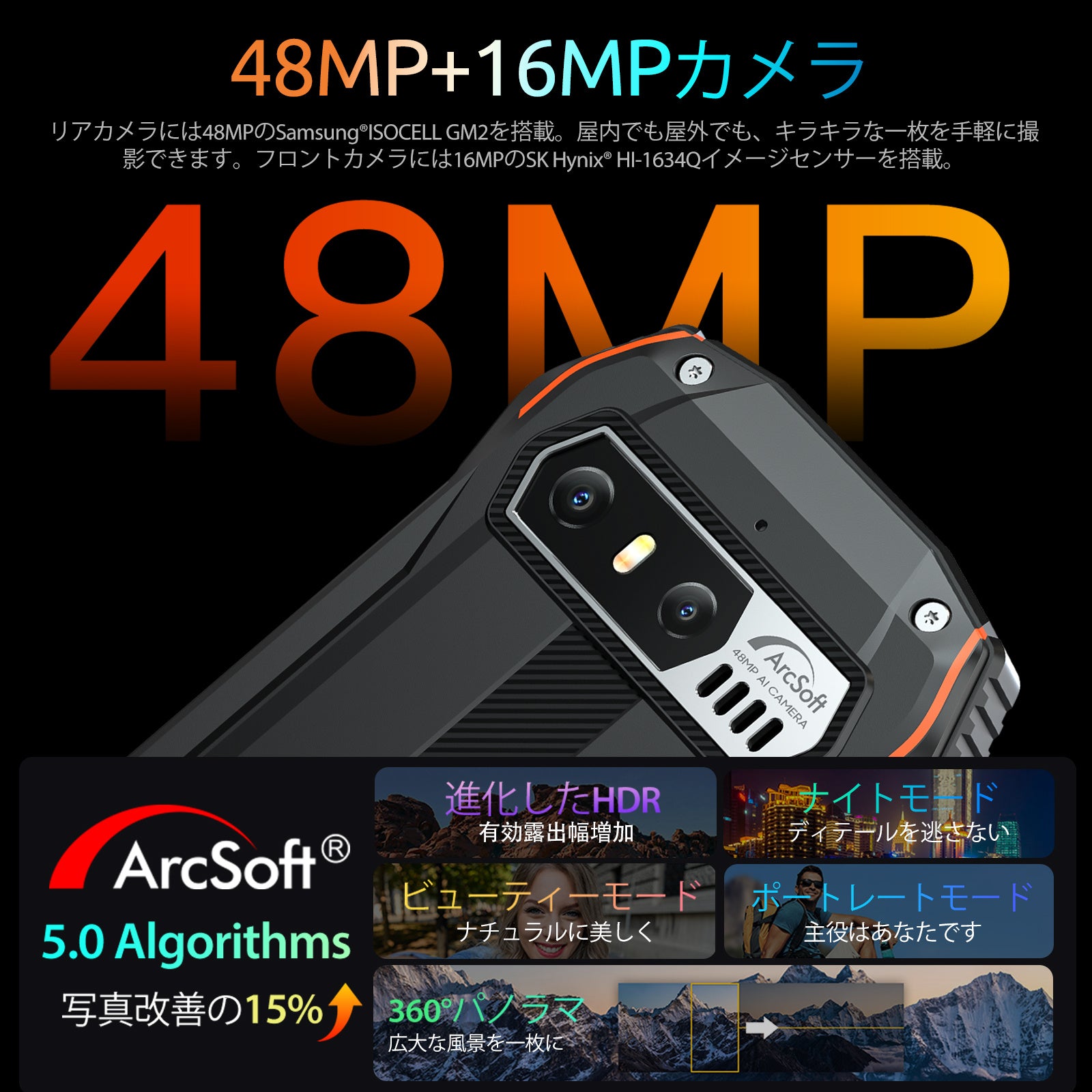 48MP+16MPカメラ+9-in-1ピクセルグルーピング技術