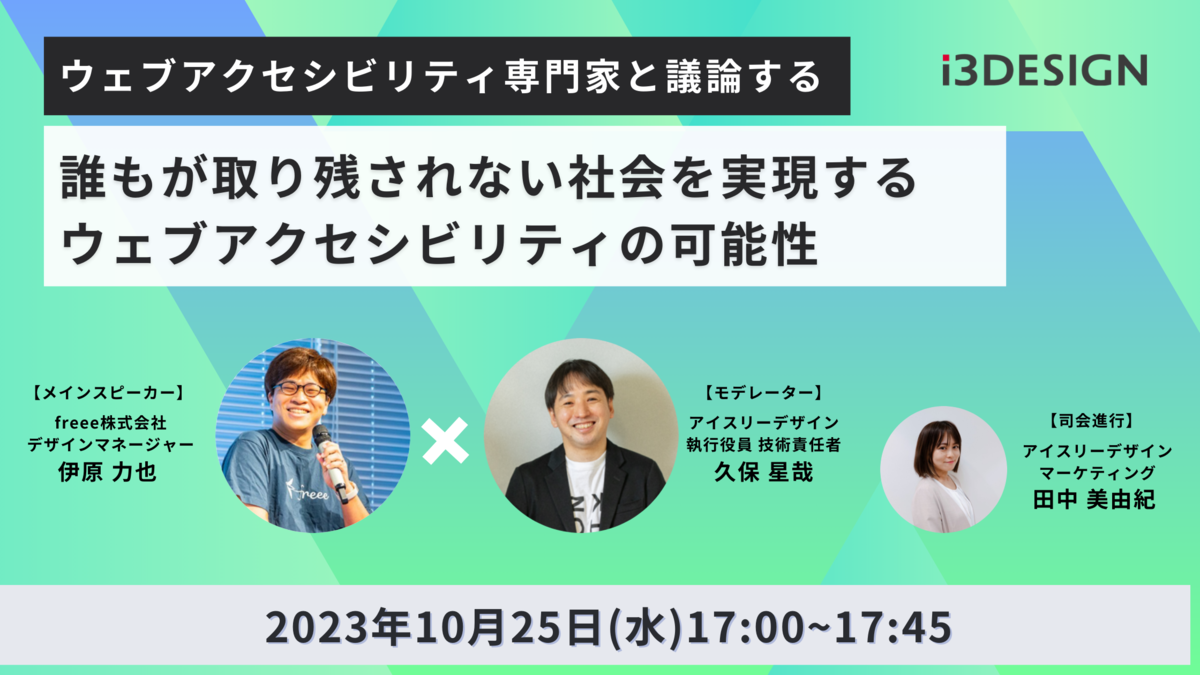 今回、ゲストとしてウェブアクセシビリティ基盤委員会の委員であり、freee株式会社のデザインマネージャーである伊原力也氏にご登壇いただき、ウェブアクセシビリティの今後の可能性について対談を実施いたします。ウェブアクセシビリティの基礎から、その課題、そして将来的な発展性について、ウェブアクセシビリティの世界で10年以上の知見を持つ伊原氏とともにディスカッションを行っていきます。