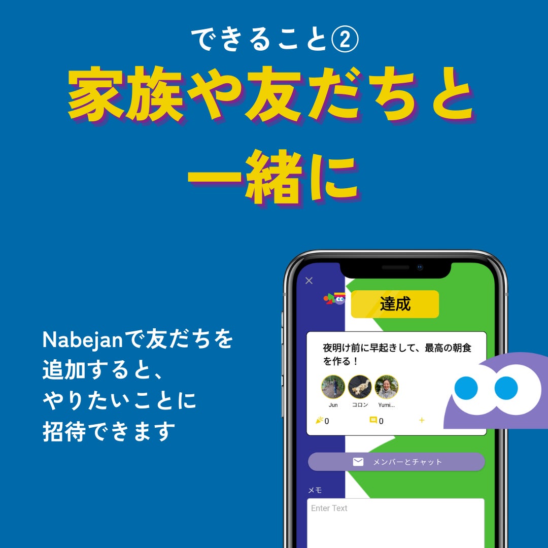 自分の幸せに着実に繋がる日常的なサービスを作りたいという思いから、やりたいことを集めて、家族や友だちと一緒にしたり、応援し合える、けれど友だちの数や応援の数は非公開という半クローズドなSNSアプリ「Nabejan」を開発しました。