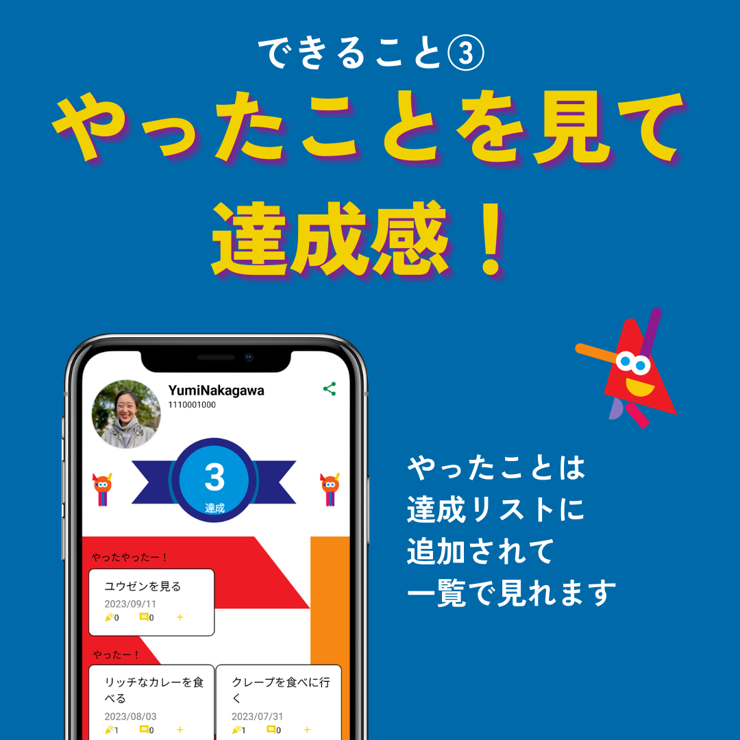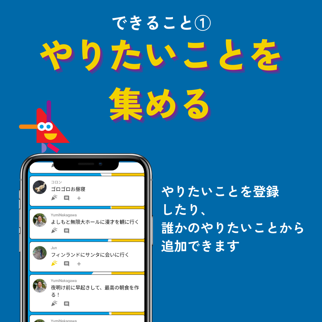 やりたいことを登録したり、だれかのやりたいことから追加できます