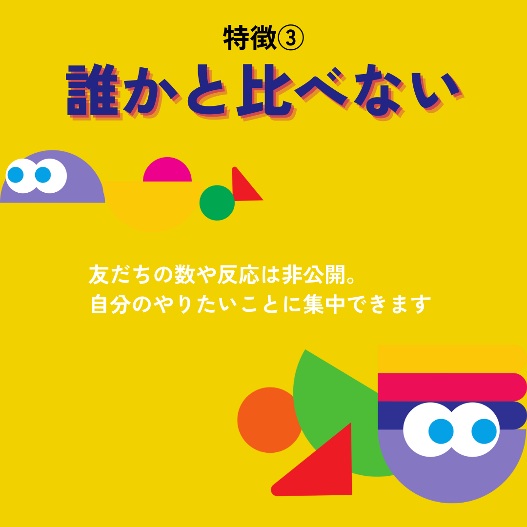 友だちの数や反応は非公開。自分のやりたいことに集中できます。