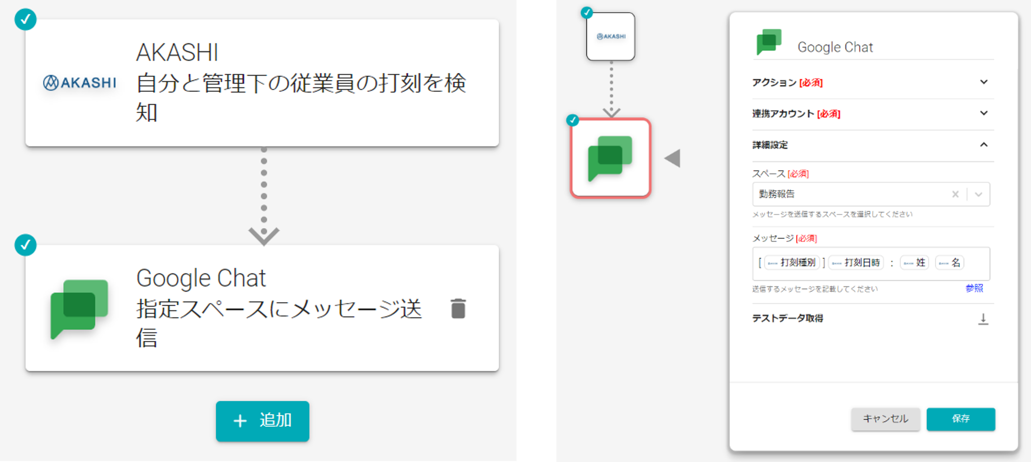 このレシピを使用することで、「AKASHI」で打刻したメンバーの勤務情報を「Google Chat」へ自動で通知することができます。