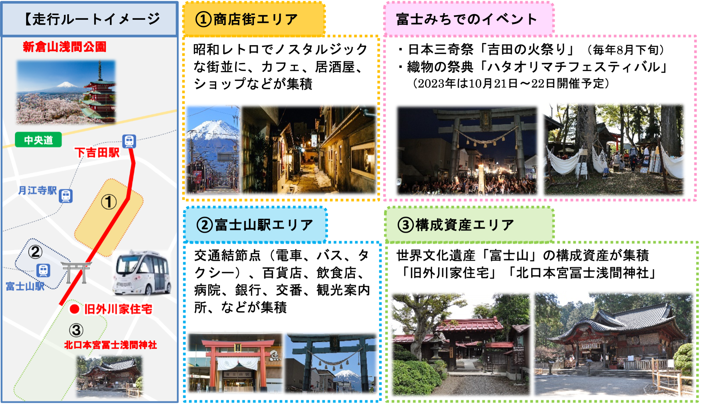 本実証は、「富士急行線下吉田駅(新倉山浅間公園)」から、世界文化遺産「富士山」の構成資産の1つである「旧外川家住宅」までの約2.1kmの区間で行われます。このルートは「富士山」に向かってのびる「富士みち」と呼ばれ、ルート周辺は主に「商店街エリア」「富士山駅エリア」「世界遺産構成資産エリア」の3つに分かれています。これらのエリアは、地域住民の生活インフラの集積拠点であるとともに、訪日外国人観光客の観光・消費面においても重要なエリアであり、自動運転EVバスの運行は、訪日観光の二次交通手段として、地域の回遊性向上や地域経済への波及効果も期待されます。
