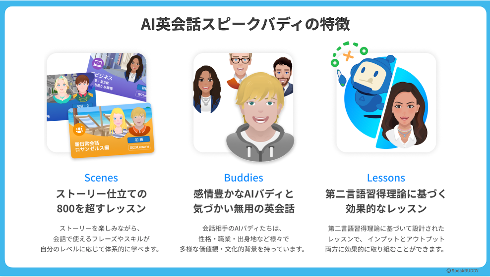 スピークバディは2016年9月にリリースした日本発のAI英会話学習アプリ。従来の「人との対話」ではなく、「感情表現豊かなAIバディ(キャラクター)との対話」を通じて、体系的に発音やフレーズ、単語、イディオムなどを学びます。第二言語習得理論と最新鋭のAIを組み合わせたこれまでにない学習体験を提供し、アプリストアでの評価は「4.5」(2023年9月時点、App storeにて)、累積学習者数は250万を突破しています。