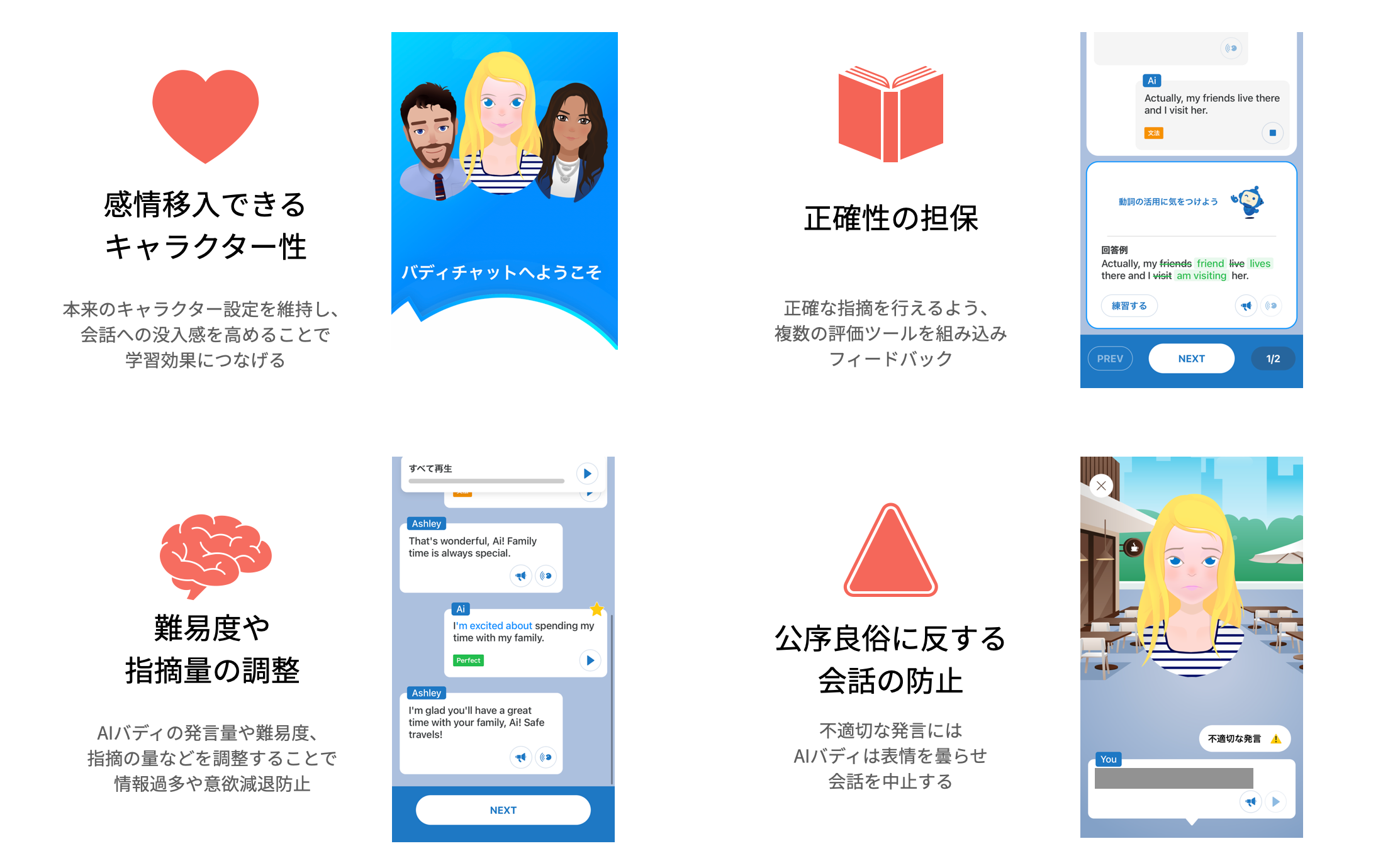 学習者から不適切な発言があった際、会話相手であるAIバディは「悲しい表情」になり、その発言内容を指摘した上で会話を終了させる仕様になっています。当社は、たとえ相手がAIであってもこのような発言は防止するべきと考えています。