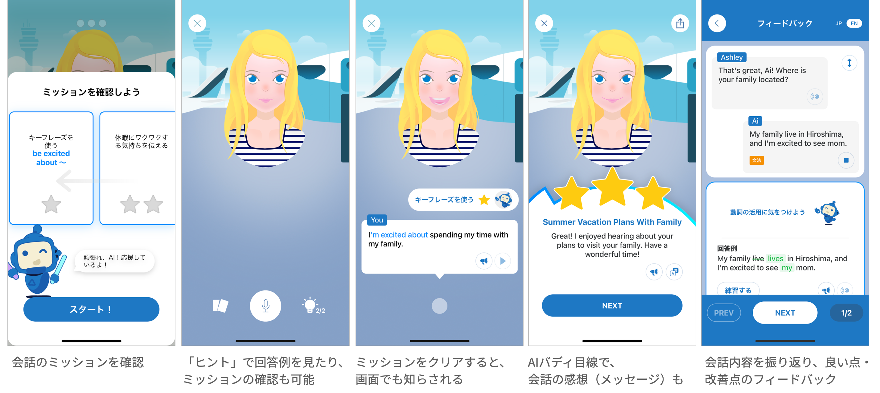 相手の発話は聞き取りが必要、沈黙が続くと英語で声をかけるなど、会話体験にリアリティを追求しています。