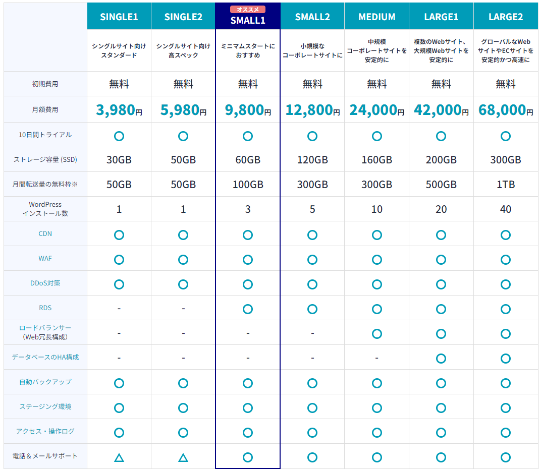 これらの豊富な機能を備えたWP-Chorusを中堅・中小企業により手軽に利用いただくため、スタータープランとして月額3,980円で利用できるシングルサイト向けプラン「single1」とストレージを増量した月額5,980円で利用できるより高スペックなプラン「single2」、の2つのプランの提供を開始しました。