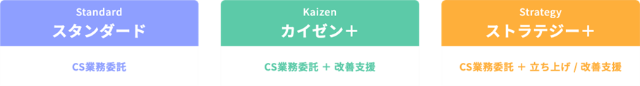 CS業務アシストサービスは、CS人材が今すぐ必要な状況だが、良い人材がなかなか採用できない企業向けにCS業務の経験が豊富でフットワークの軽いプロ人材が実務を遂行していくサービスです。定型化しやすい業務の代行だけでなく、業務の効率化や質の向上を併せて行う「カイゼン+(プラス)プラン」、そしてCS設計アシストサービスの「ストラテジー」を合わせて提供する「ストラテジー+(プラス)プラン」も提供します。