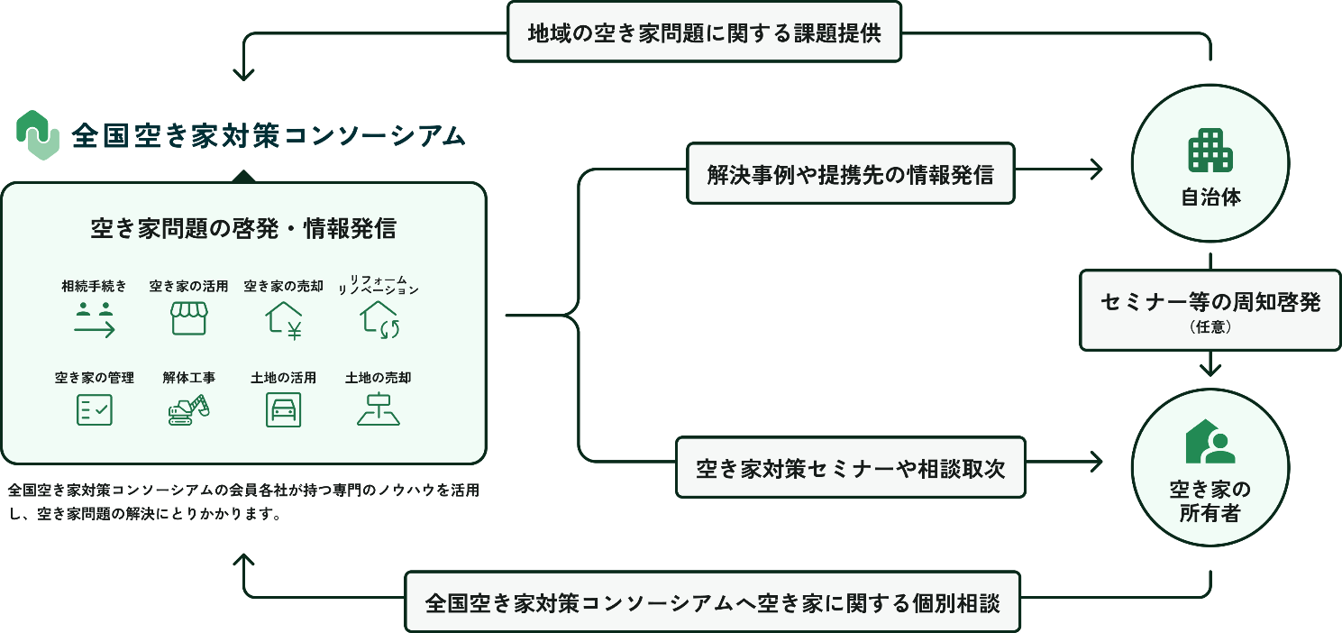 そこで、空き家問題を具体的に解決する一助となるべく、核となる協議体として、「全国空き家対策コンソーシアム」を設立しました。独自に専門ノウハウを持つ事業会社がコンソーシアムを形成し、知見を共有することで、各事業者の空き家所有者に対する啓発活動を強化し、具体的な課題解決を促進することで、空き家増加抑制に努めて参ります。
