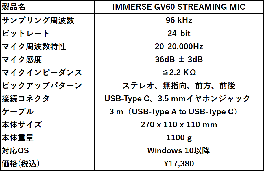 【IMMERSE GV60 STREAMING MICの主な特徴】