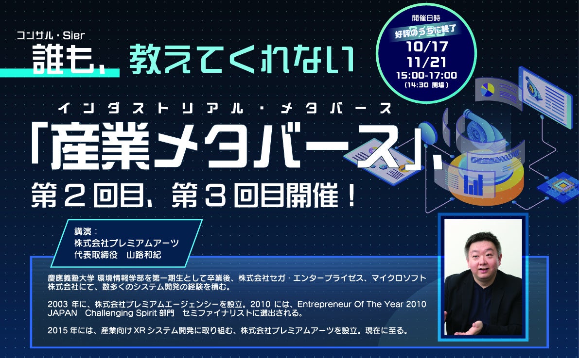 先日開催された第1回では、産業メタバースの概要を徹底的に深堀させていただき、多くの方より高評価をいただきました。続いて第2回を、10月17日(火)に開催させていただきます。