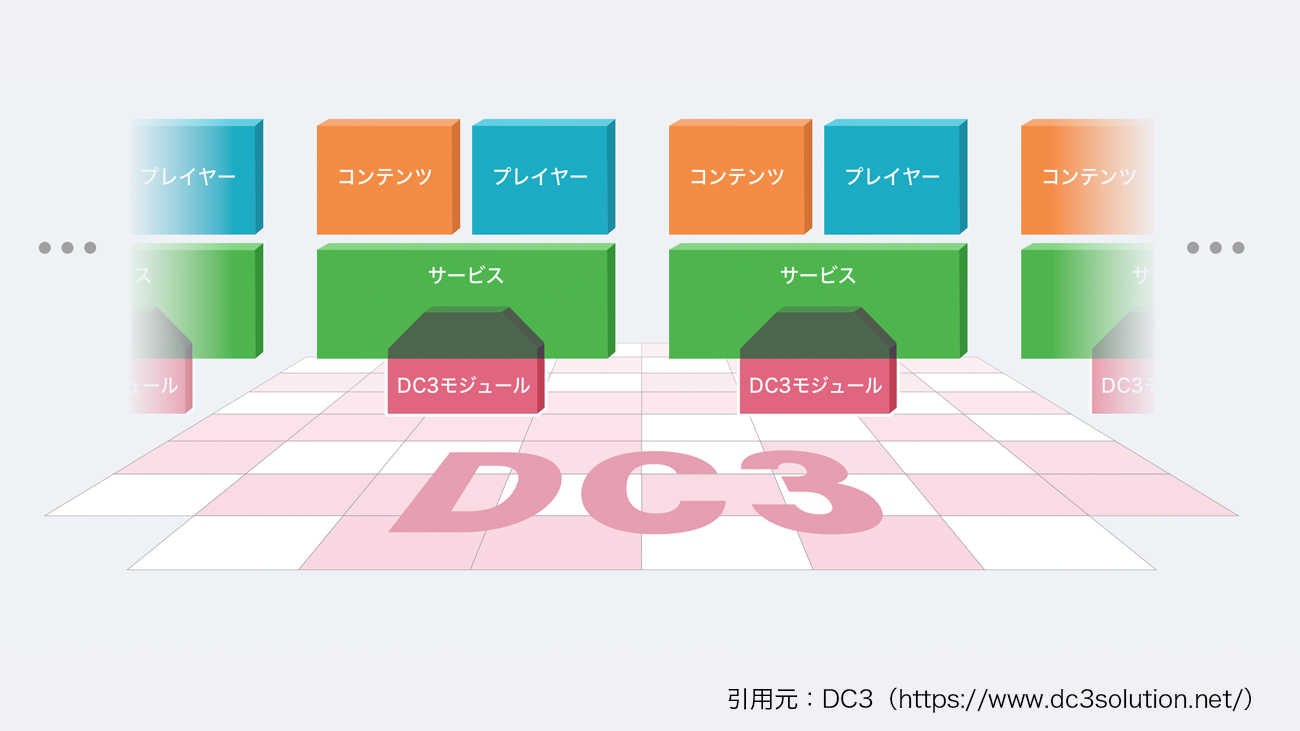 サービス事業者様が運営するサービスにDC3モジュールが組み込まれることで、サービス内でDC3コンテンツを扱うことができるようになります。