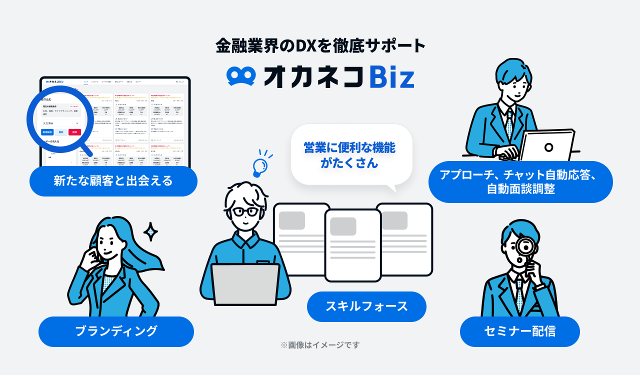 『オカネコBiz』は、FP(ファイナンシャルプランナー)やIFA(金融仲介業者)がオンライン上で見込み客の獲得から顧客管理までできるマッチング型営業ツールとして2018年11月に提供開始しており、登録プランナーは700名以上、導入企業累計社数は250社以上(*1)と、銀行・証券・保険それぞれの分野で導入が進んでいます。