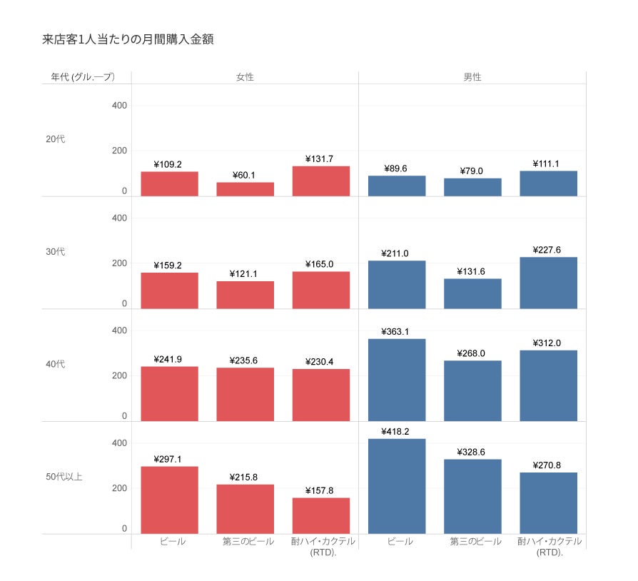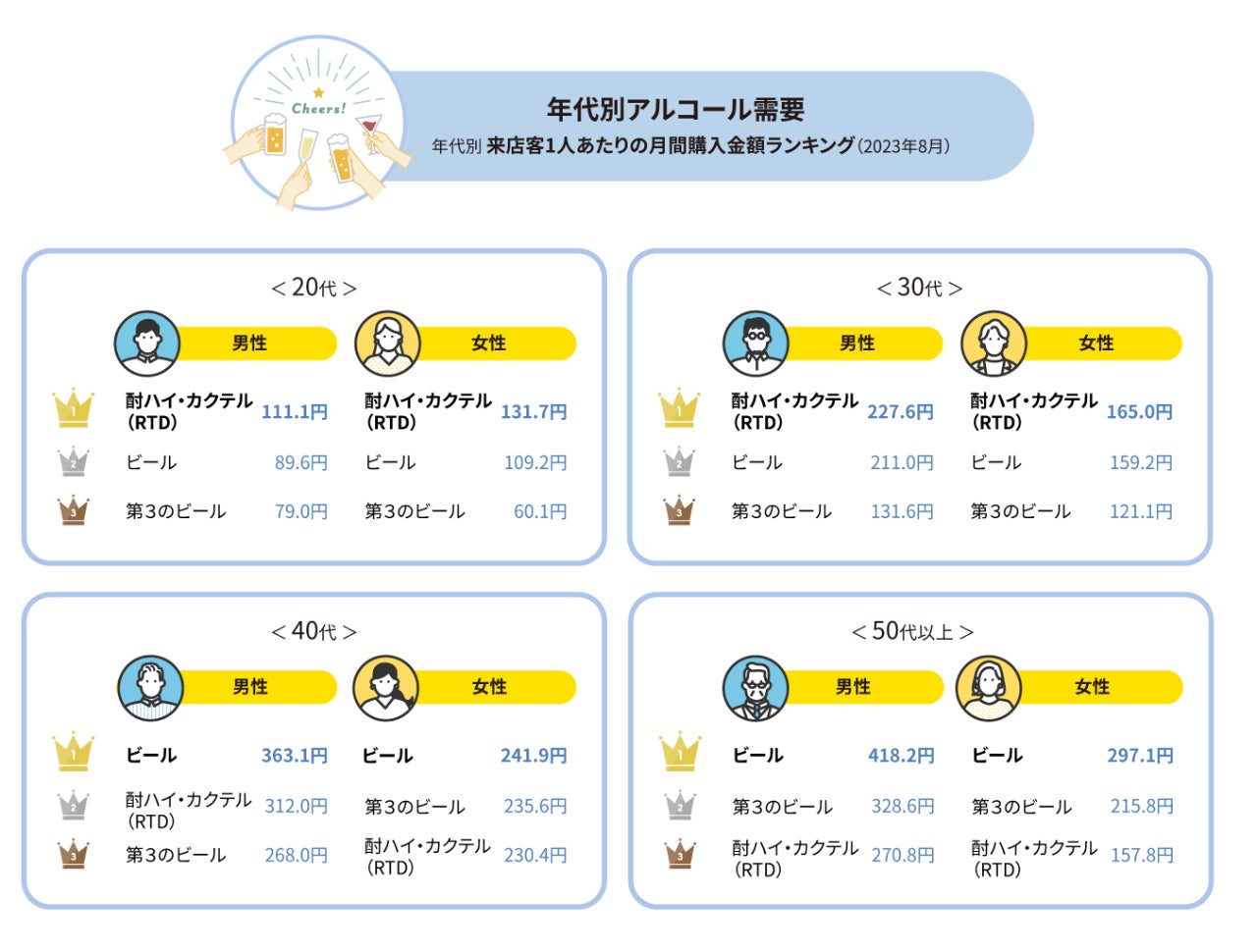 2023年8月の来店客1人当たりの月間購入額を年代別に見てみると、20代と30代の男女の月間購入金額1位は「酎ハイ・カクテル(RTD)」、一方、40代と50代以上の男女の1位は「ビール」でした。1位の月間購入額を年代男女別に比較すると、50代以上の男性が418.2円と最も高く、最も低い20代の男性と比較して約3.8倍の金額でした。