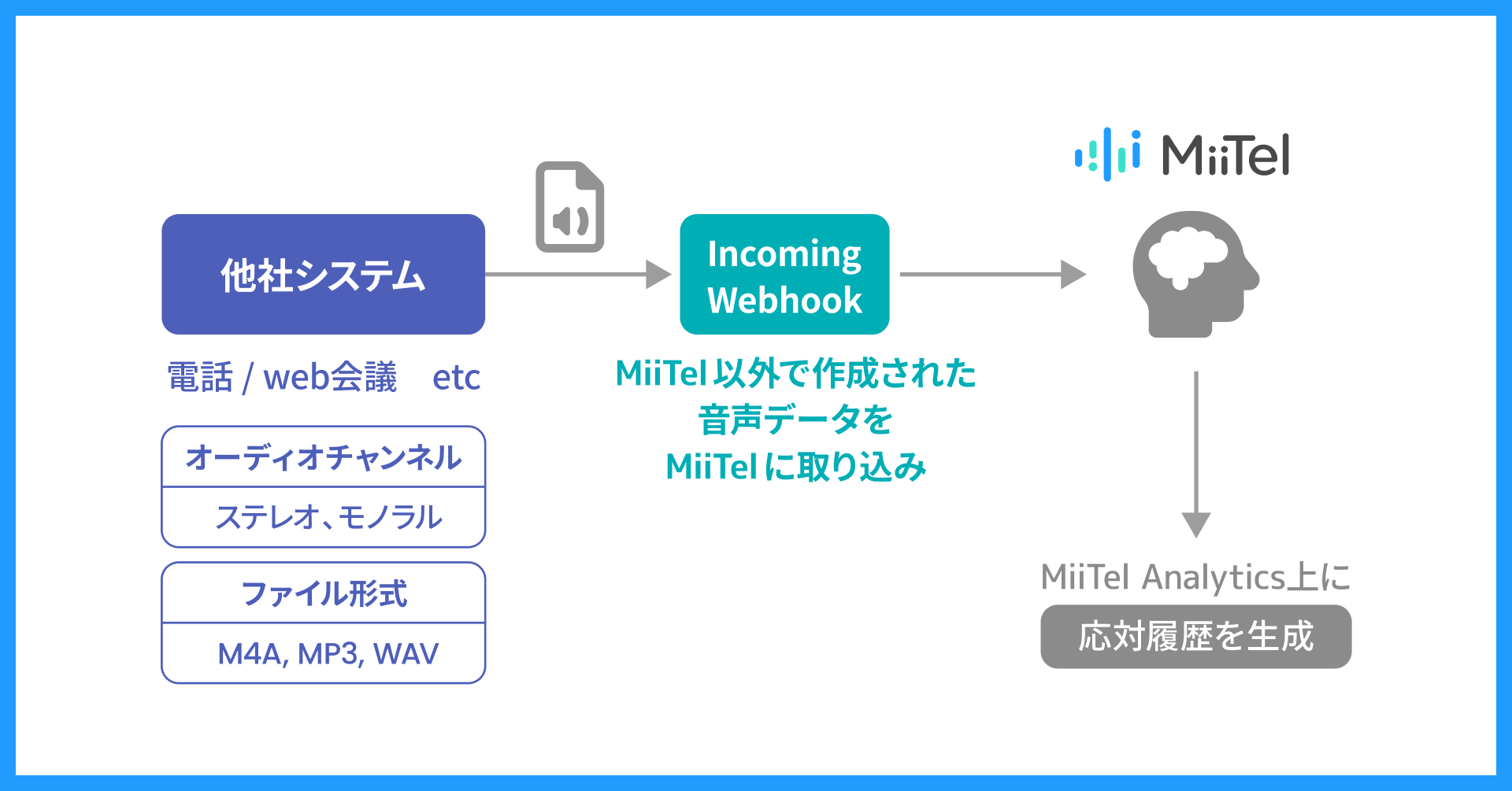 MiiTel以外で作成された音声データを MiiTel Analyticsに取り込む機能。他社の電話を利用して生成した音声録音ファイル(wav、m4a、mp3のいずれか、ステレオ録音)ならびにデータ(JSON形式、ID、通話種別、グループ名、発信時刻、通話開始時刻、終話時刻、発信元電話番号、着信電話番号など)を取り込むことにより、MiiTelでの通話に対して提供している全文文字起こし、要約、話速やトーク・リッスン比率、抑揚などの通話音声分析、音声感情認識といった機能を利用できるようになります。
