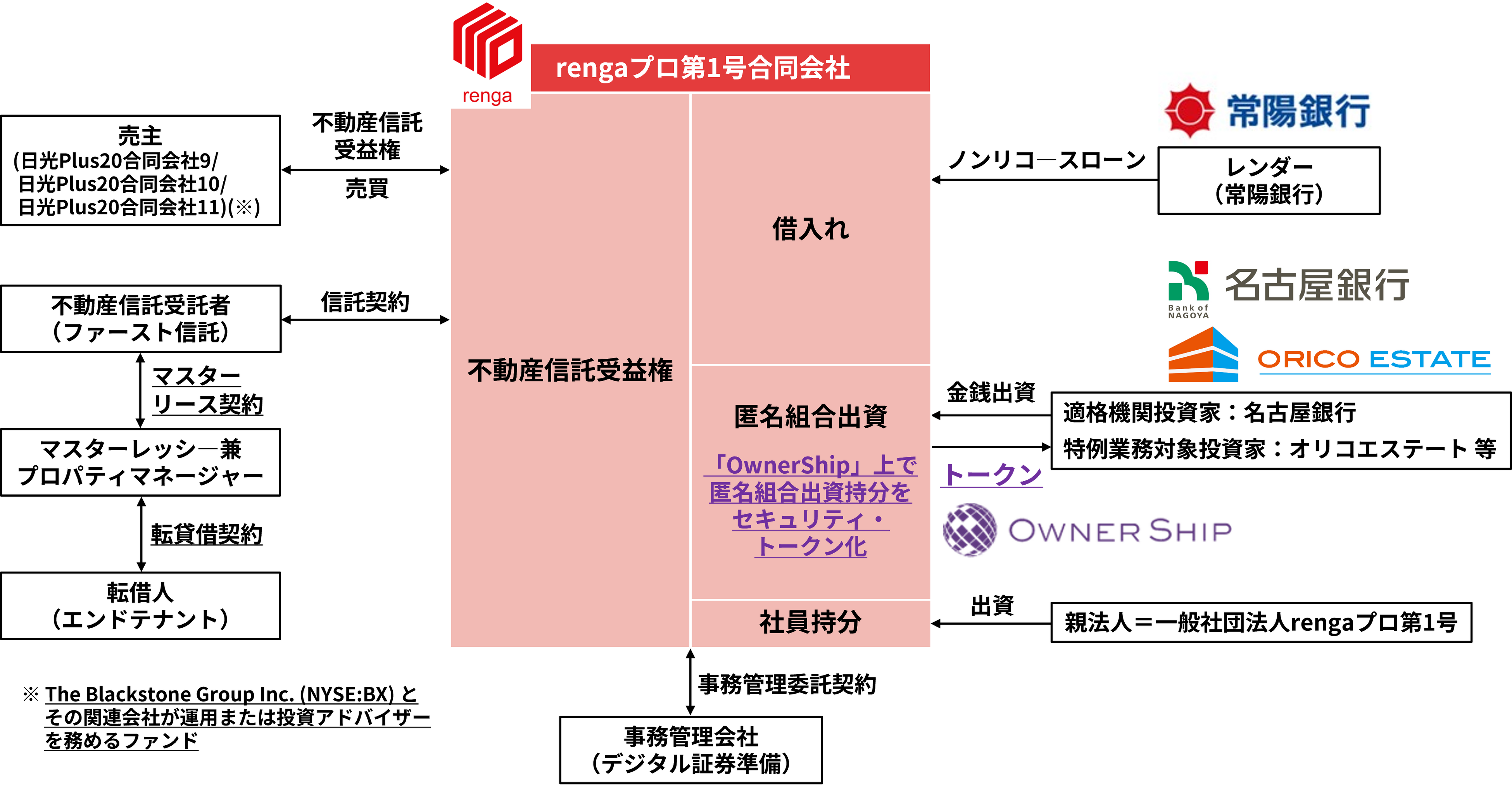 本ファンド組成にあたっては、①The Blackstone Group Inc. (NYSE:BX)とその関連会社が運用または投資アドバイザーを務めるファンドが対象不動産の売り手となり、②DS社の株主である常陽銀行(※同行はCVC(コーポレートベンチャーキャピタル)ファンドであるJレイズ投資事業有限責任組合を通じてDS社に出資)がノンリコースローン(*5) に取り組み、③株式会社名古屋銀行が適格機関投資家として、株式会社オリエントコーポレーションの 100%子会社である株式会社オリコエステート等が特例業務対象投資家として参加しました。